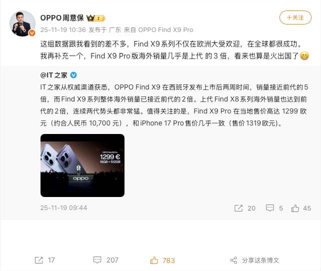 OPPO Find X9系列的热销态势已形成全球蔓延之势。早在11月19日,IT之家便通过权威渠道公布了该系列销量数据:OPPO Find X9在西班牙上市仅两周,销量便接近前代的5倍,Find X9系列整体海外销量更达到前代的2倍。随后,OPPO Find系列产品负责人周意保通过微博转发该信息并认证补充,明确Find X9 Pro版海外销量几乎是上代的3倍,进一步印证了其在海外高端市场的号召力。