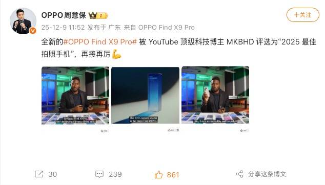 随后,OPPO Find系列产品负责人周意保通过微博跟进扩散这一喜讯,进一步扩大该机型的行业影响力,也让更多消费者关注到其在影像领域的突破——从哈苏认证2亿像素潜望长焦到出色的暗光拍摄能力,Find X9 Pro的影像表现成为吸引用户的关键亮点。
