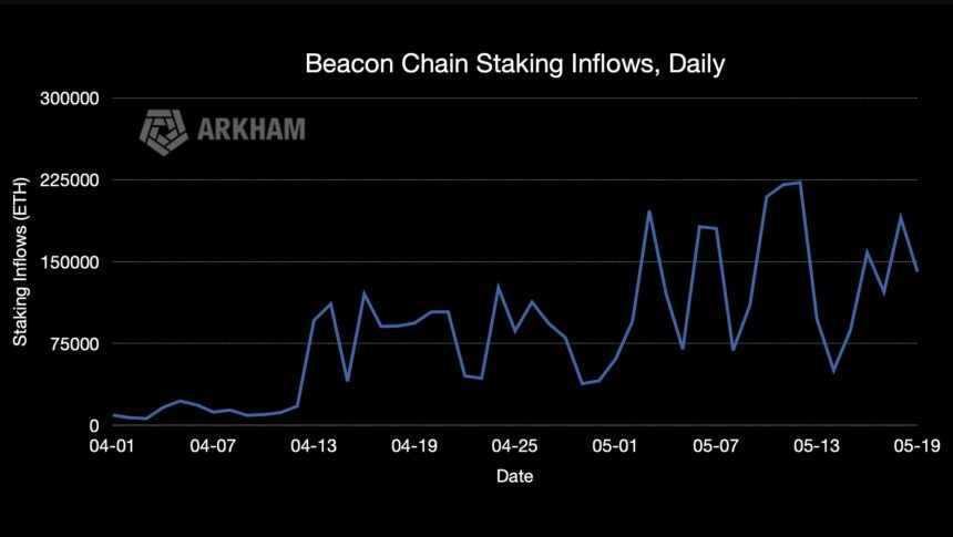 根据研究公司Arkham Intel的数据,目前存入的信标链的以太坊总量比4月12日增加了约125万个ETH。每天存入的数量差异很大,有时甚至高达225,000个ETH,单日就超过了4亿美元。资金流入图表显示,在Shapella升级后出现了明显的峰值,这与信标链完全启用提款的时间完全吻合。