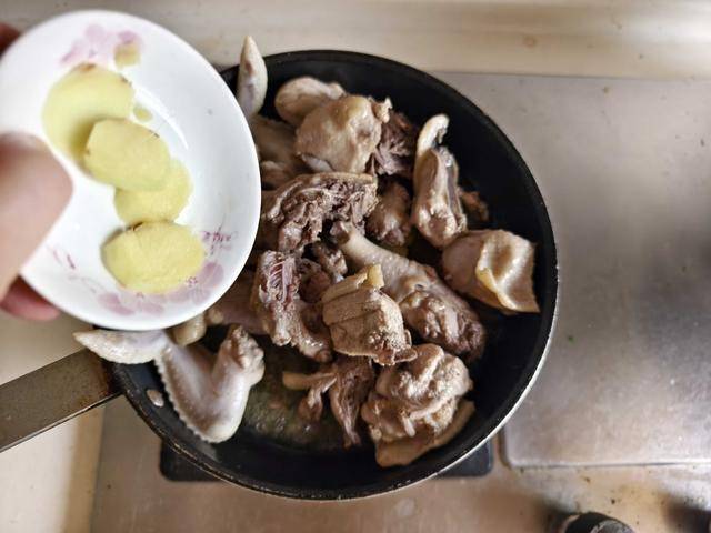 制作过程:1. 烧热锅放入少许油,将准备好的土鸡块放进锅中煸炒干水分,再将继续土鸡块炒至表面微微发黄加入几片姜继续翻炒几下;