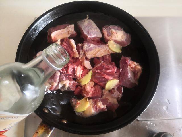 制作过程:1. 烧锅水,将准备好牛腩块放入冷水锅中焯煮,加入少许姜片和高度白酒去腥,焯出浮沫后捞出冲洗干净;