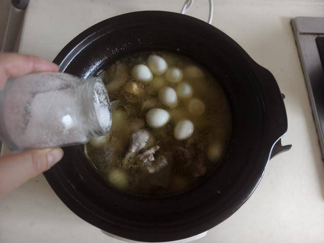 4. 将鹌鹑蛋煮熟后去壳, 还剩下20分钟左右时放入电炖锅中继续炖煮,最后炖煮好后加入少许盐和胡椒粉调味,盛入钵中撒上少许葱花即可。