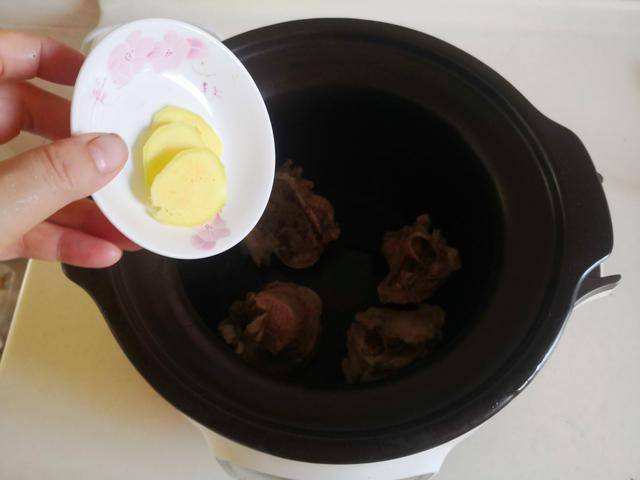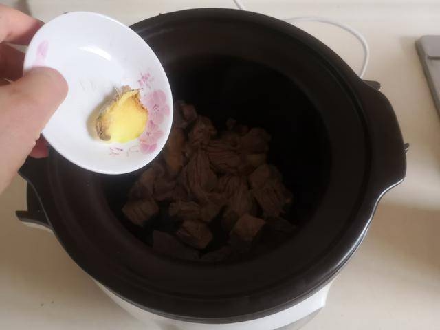 2. 将焯好的牛肉块放进电炖锅中,加入几片姜,再一次性加入足量的水;