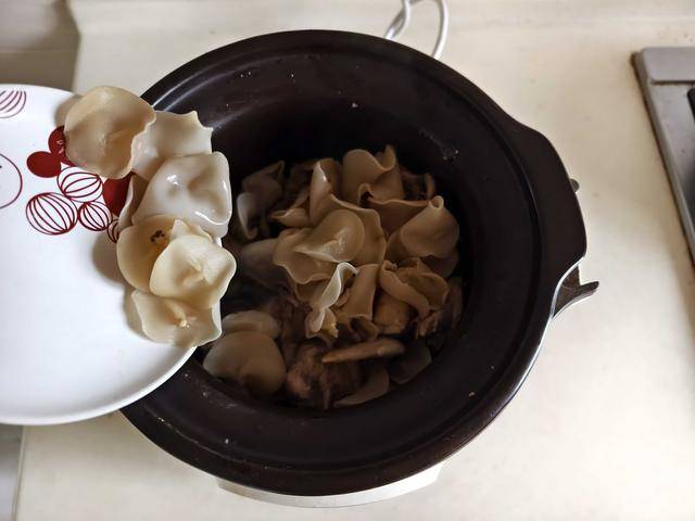 2. 提前将木耳用冷水泡软, 再将炒好的土鸡块和泡软的木耳放入电炖锅中;