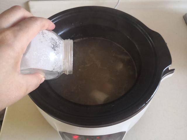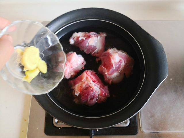 2. 将焯好的棒骨块放入电炖锅中,加入几片姜,再加入足量的水,注意水要一次性加足,不要中途加水;