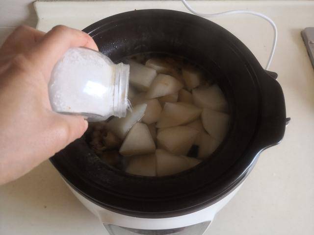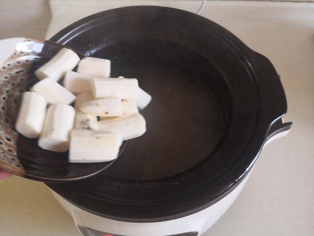 5. 还剩下20分钟时加入板栗仁,还剩下十分钟时加入准备好的山药段继续炖煮好;
