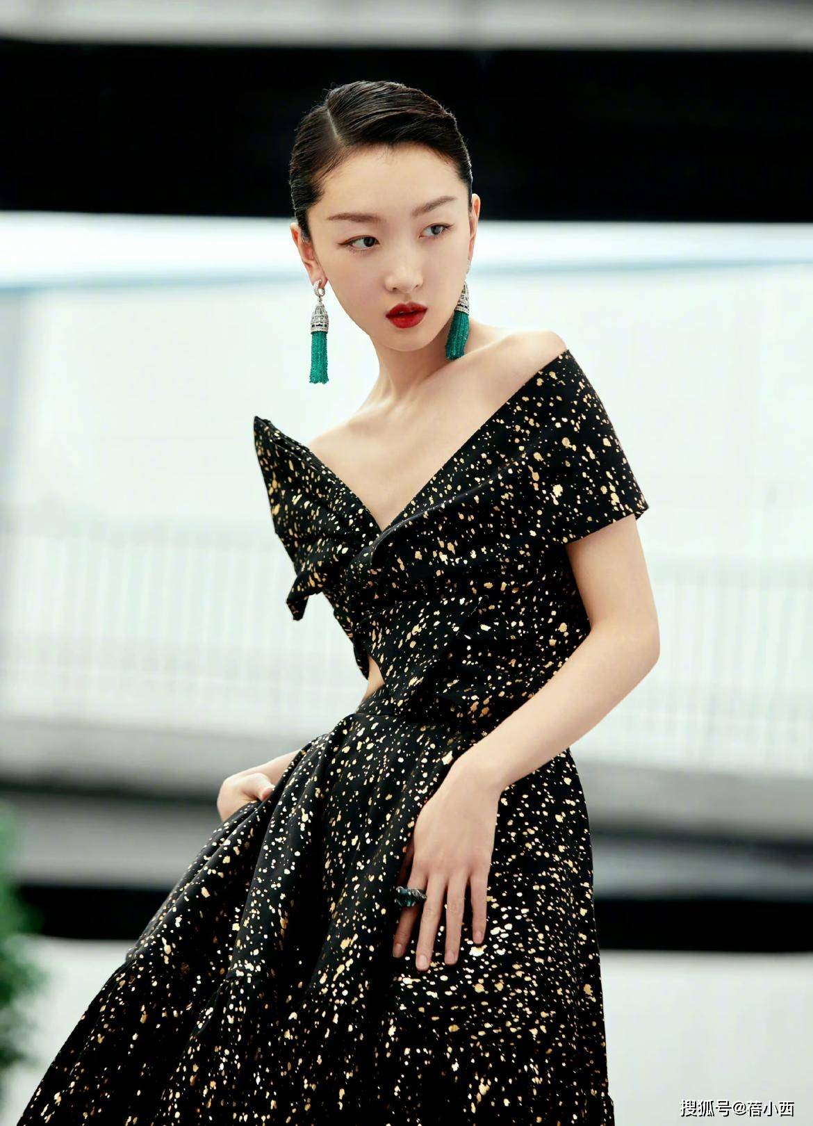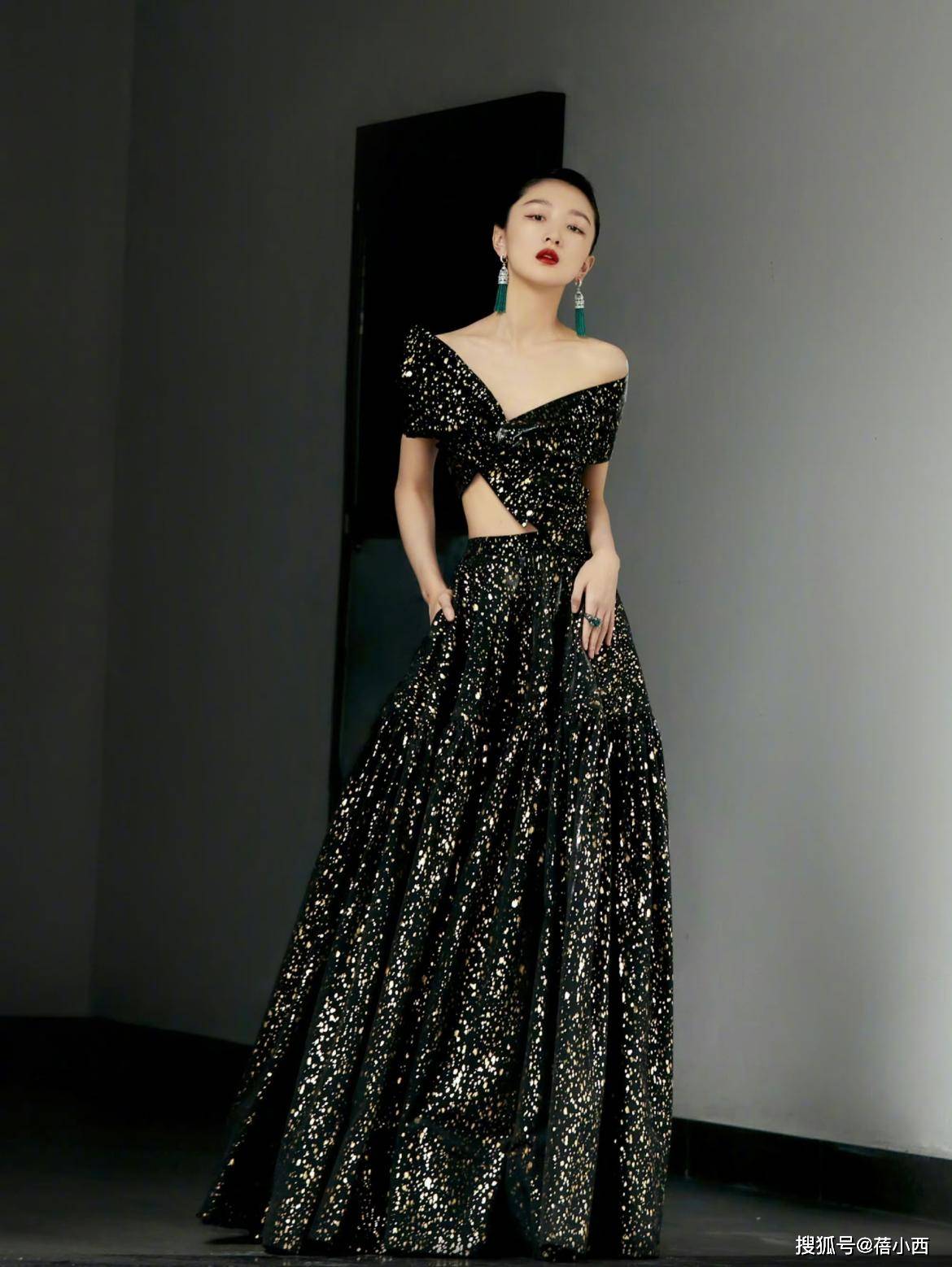 出席活动,女明星们的礼服穿搭总是别出心裁,像下面这条连衣裙在裙身上结合金色的亮片作为修饰,就能让这身连衣裙看上去更加贵气,充满着高级感,而且肩部结合了露肩设计,不规则的剪裁也打破了常规,时尚度超高。