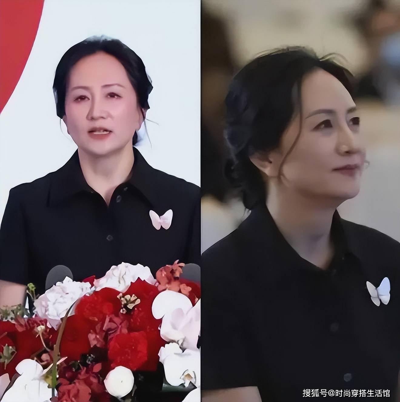 高饱和度的颜色确实显年轻,但是对于步入中年的妈妈来说,大面积的高饱和度色块会显得很浮夸,失了一些优雅和高级。所以在孟晚舟的穿搭中,多以黑白色系和低饱和度的驼色、焦糖色为主。