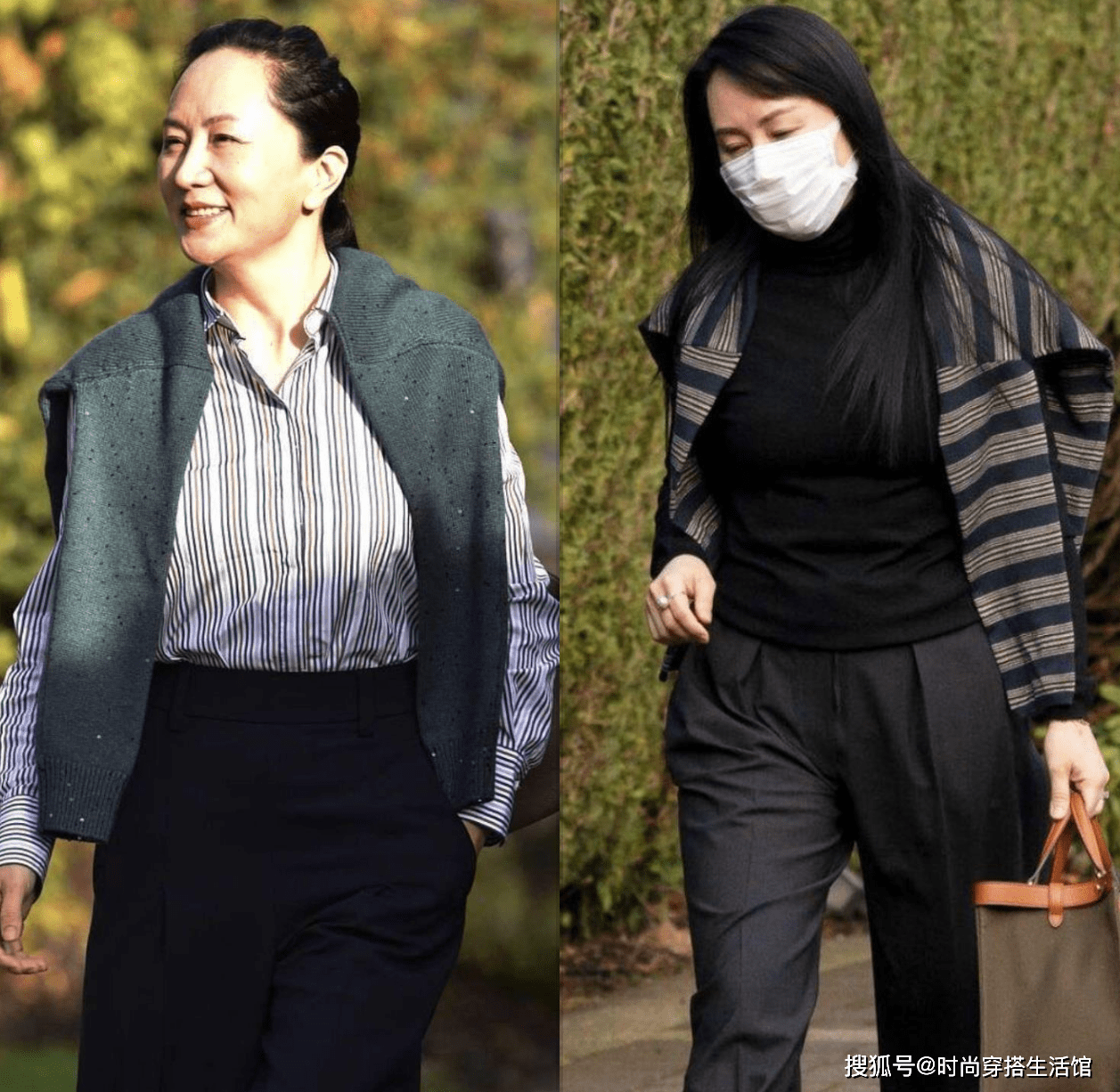 孟晚舟还非常喜欢简约的经典款服装,各种基础款式百搭又显气质,与此同时她还懂得提升亮点的散发。黑色高领打底衫叠穿条纹披肩,款式简约大气却显得格外清爽,通身的深色调显瘦显高,条纹元素增加造型层次感。