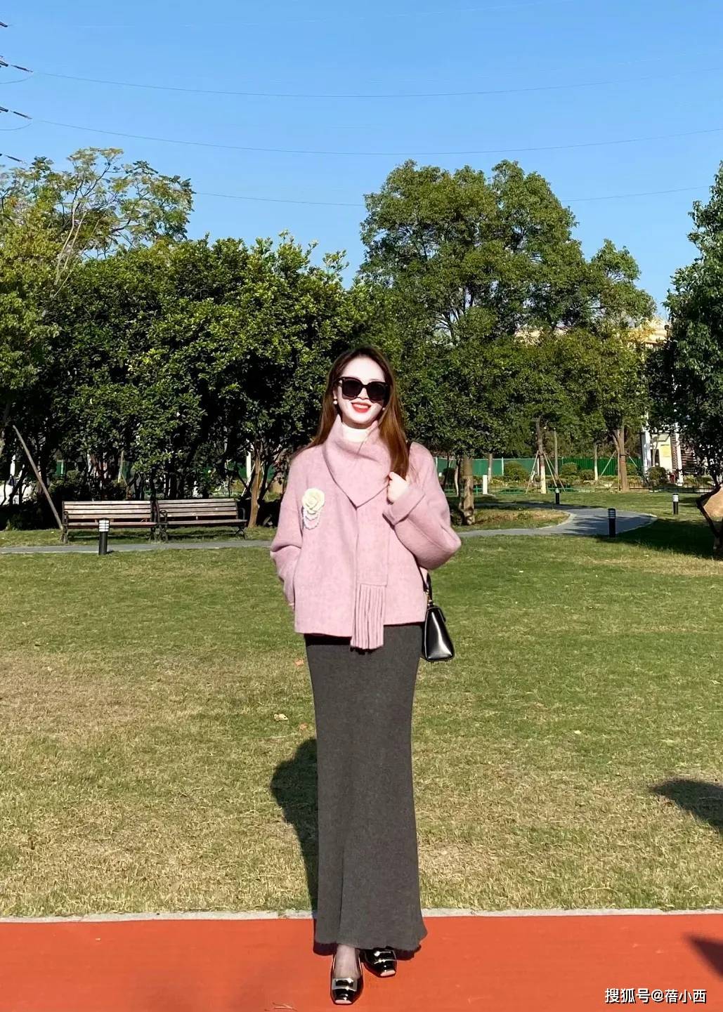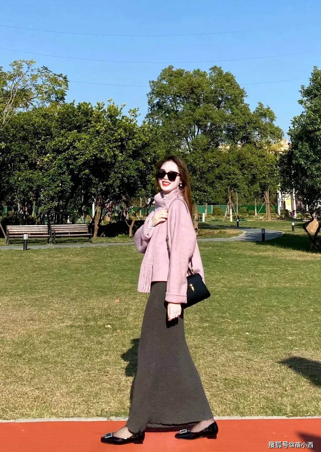 针织半裙是粉紫色毛呢外套的“最佳拍档”,软糯的质感和毛呢的挺括形成反差,温柔感翻倍,选款时重点关注颜色,可以选择这种低调的深灰色,长度到脚踝,能遮住小腿的赘肉,不会显得拖沓,不管是通勤还是日常逛街都合适,搭配短靴或乐福鞋,温柔又利落。