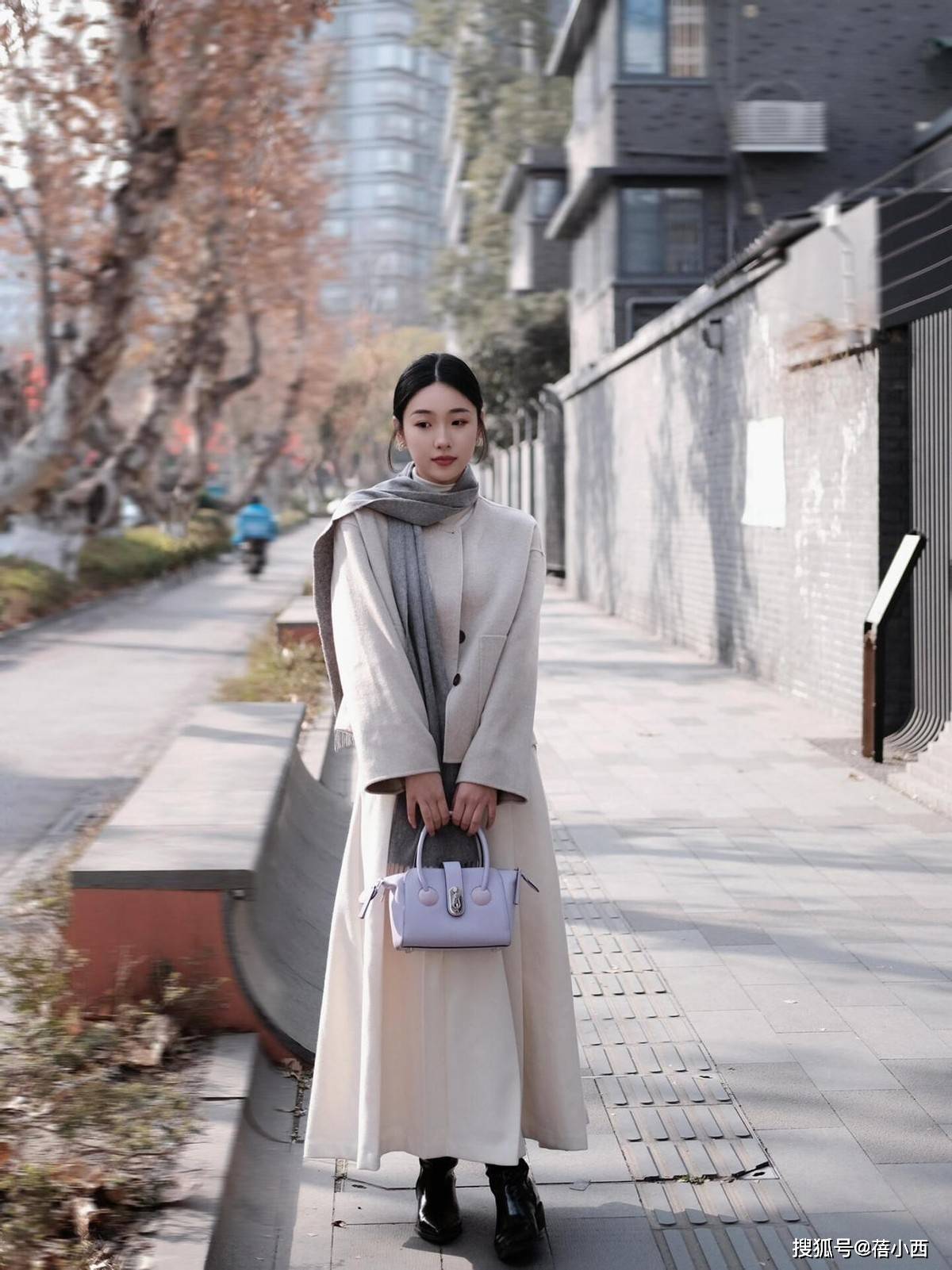 喜欢极简风的姐妹可以试试这一套,米白色毛呢外套配同色系半身裙,顺色穿法看着就特别显高挑,而且完全不臃肿,立领大衣的线条简约又大气,宽松的版型裹在身上,慵懒又有气场。脖子上搭条浅灰色围巾,软软糯糯的,不会让整体看起来太单调。最点睛的就是那个淡紫色小手提包,浅浅的紫色在米白的主调里特别亮眼,一下子就让简约的穿搭多了份精致,再配双黑色短靴,柔中带刚的气质拿捏得死死的。