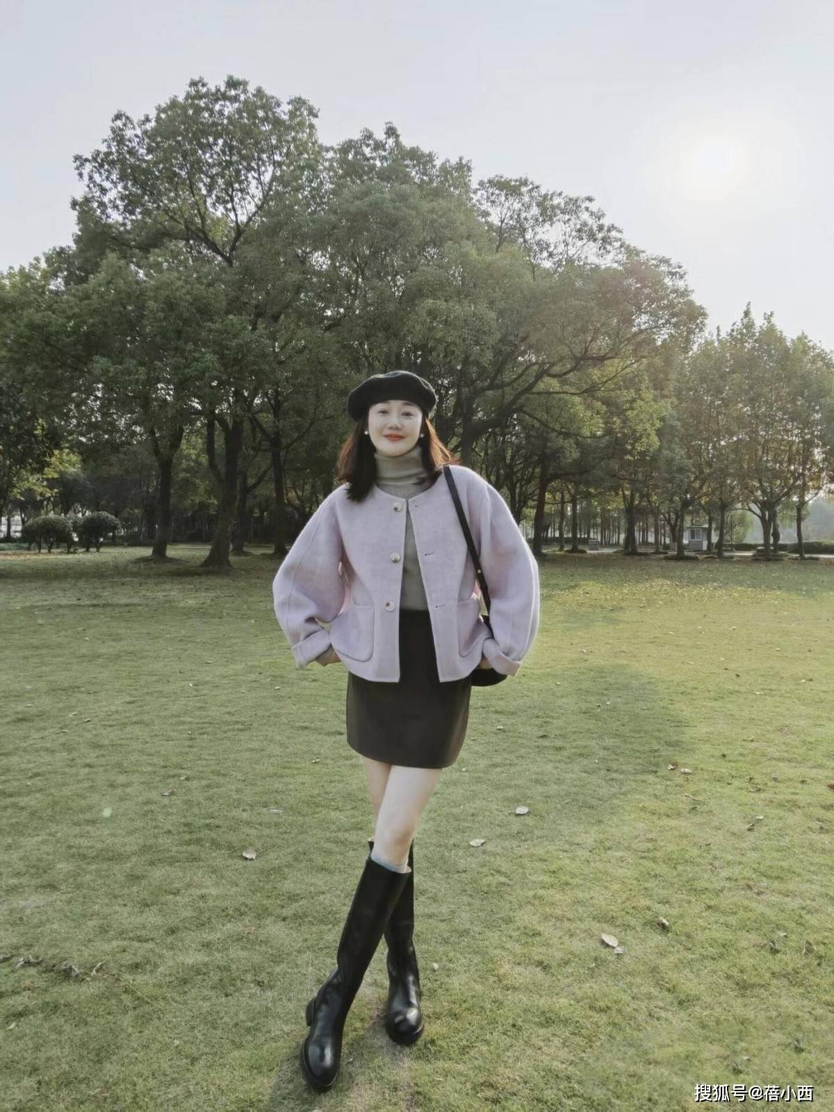 小个子可以来尝试这一套搭配,浅芋粉色短款毛呢外套超级温柔,小香风的圆领设计加上泡泡袖,少女感直接拉满,短款版型还特别显腿长。内搭浅灰色高领针织衫,简单又百搭,刚好中和了外套的甜腻。下半身配深棕色皮短裙,哑光皮质的硬朗和粉色的柔美撞在一起,一点都不违和,再踩上黑色高筒靴,酷飒感立马出来了,头上的黑色贝雷帽一戴,法式那味儿瞬间就有了,整体甜中带酷,特别灵动。