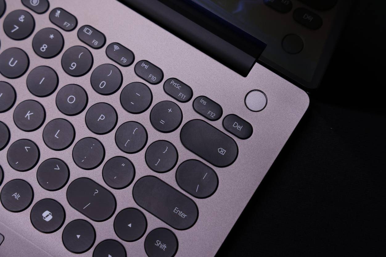 键盘表面还做了多层复合油漆涂层,抗污耐磨,持久如新。此外,电源键被独立放置在键盘区域外的右上角,并集成指纹识别,兼顾了便利性与安全性。