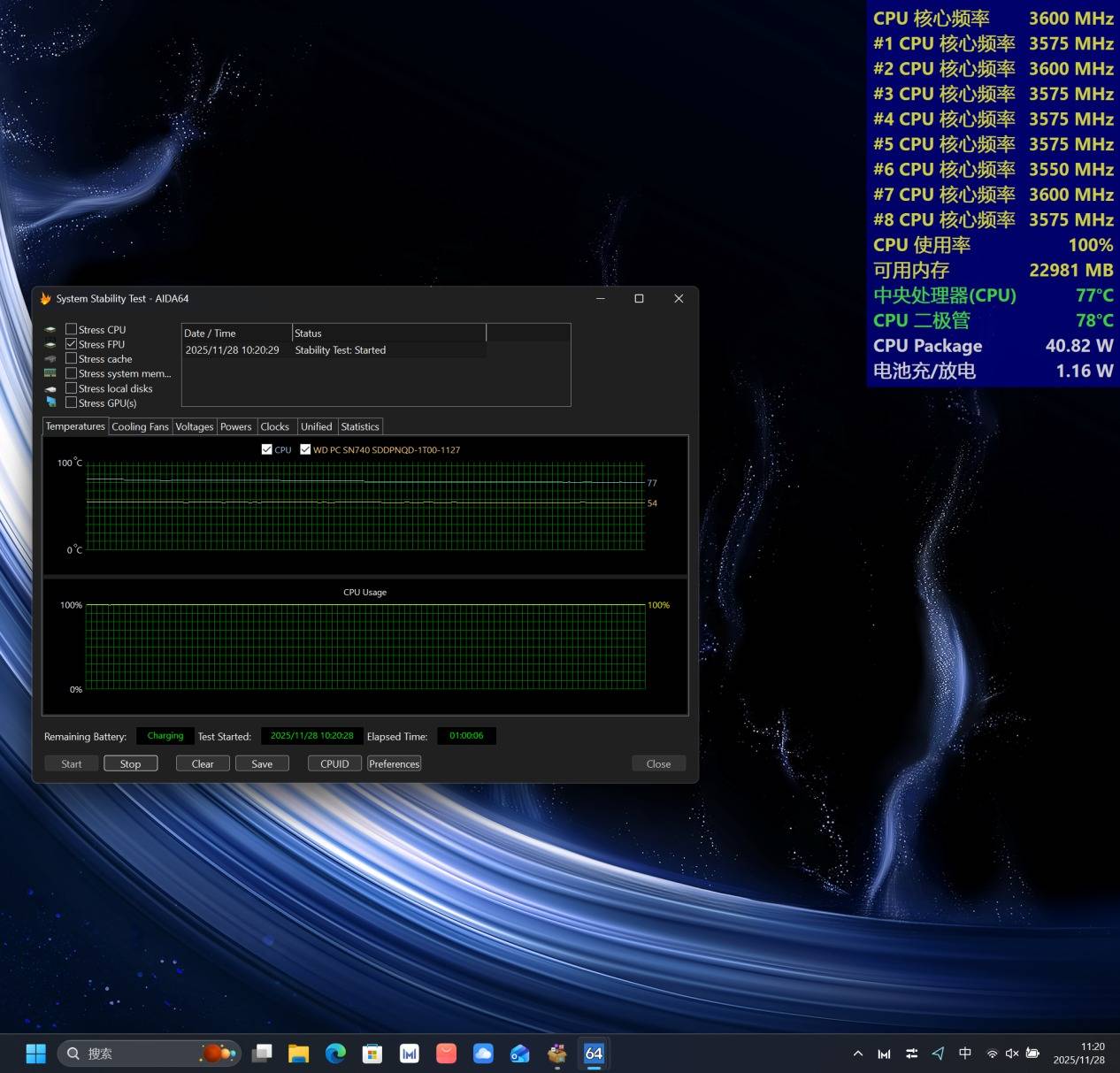 使用AIDA 64 Stress FPU进行CPU单烤测试,在高性能档位,测试时间30分钟,CPU封装功耗稳定40W,温度78度左右,全核心频率3.55GHz~3.6GHz,这一性能释放水平属于当下轻薄本中的平均主流水准。