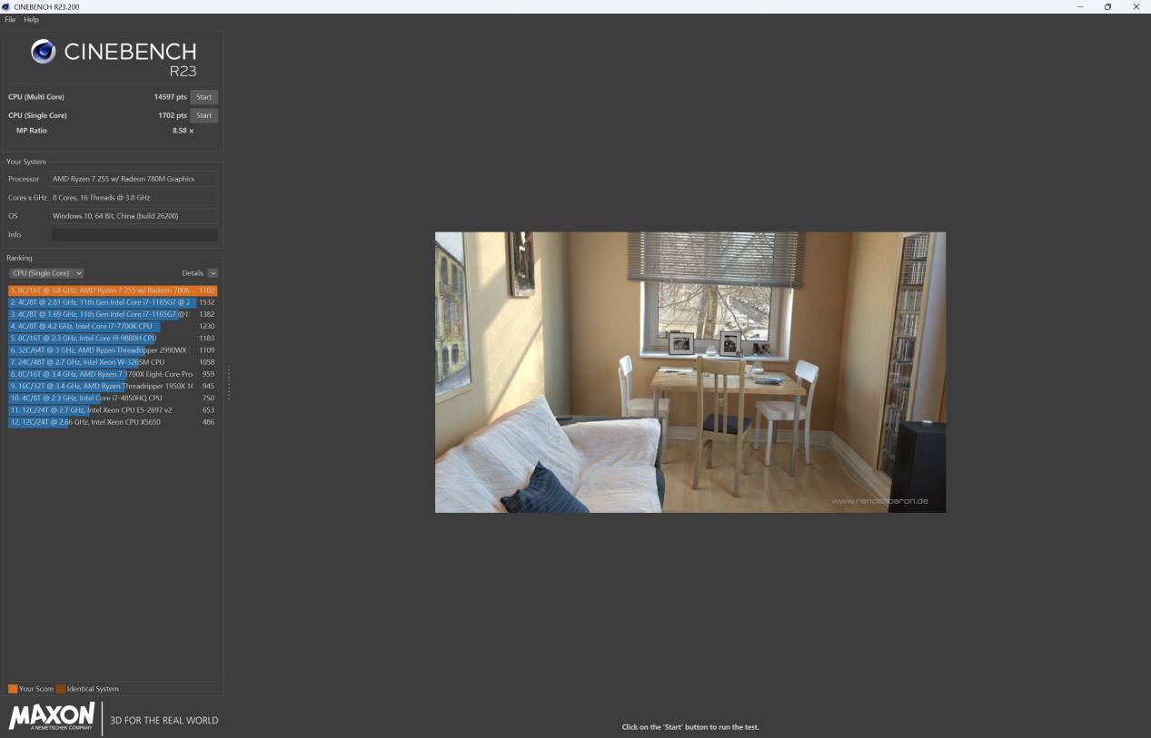 在CINEBENCH R23/2024中,其在CINEBENCH R23中单核1702pts,多核14597pts;CINEBENCH 2024中单核100pts、多核842pts。