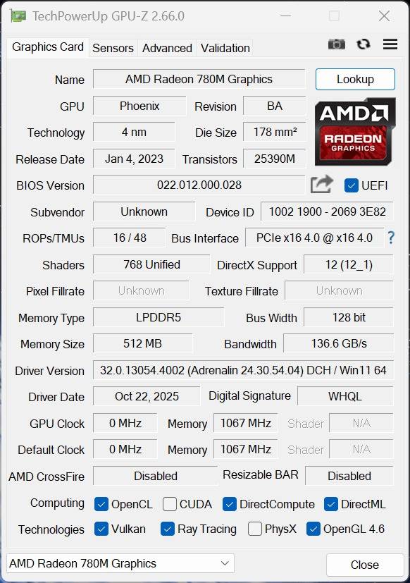 iGPU采用RDNA 3图形架构,型号名称Radeon 780M,频率2600MHz。