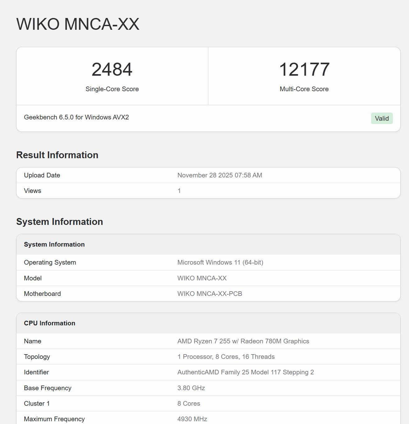 在Geekbench 6中单多核性能得分分别为:2484与12177分。