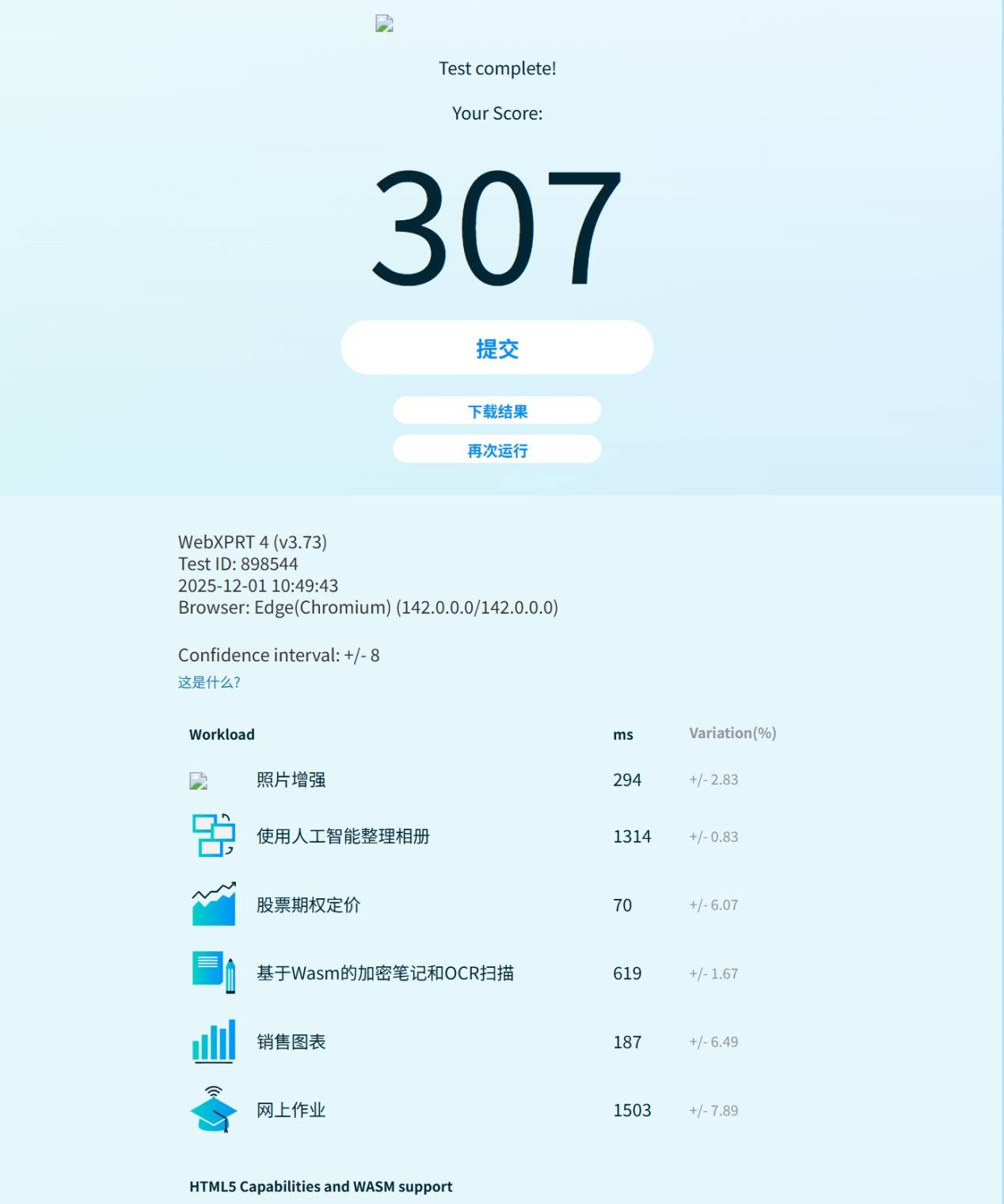 在WebXPRT4中,包含了基于HTML5、Java等的网页图片编辑、AI图册等功能的测试,加权后最终总评为:307分。