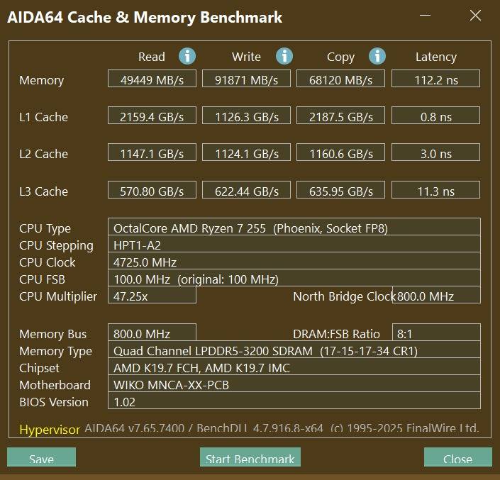 在AIDA 64 Memory&Cache BenchMark中,内存的读取、写入、复制速度分别为49449MB/s、91871MB/s、68120MB/s,延迟为112.2ns。