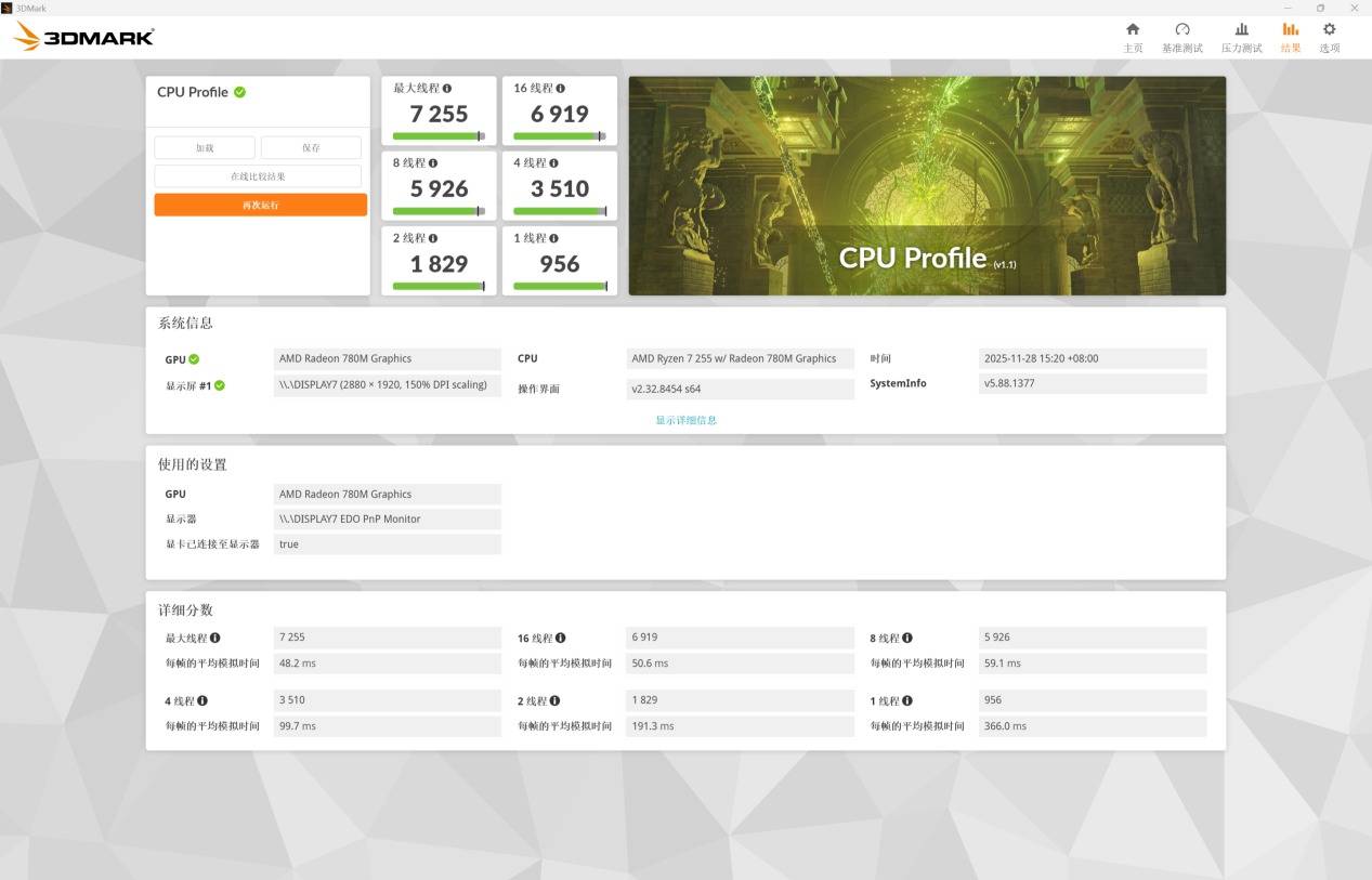 在CPU Profile中,单线程性能得分为956分,多线程性能得分为7255分。