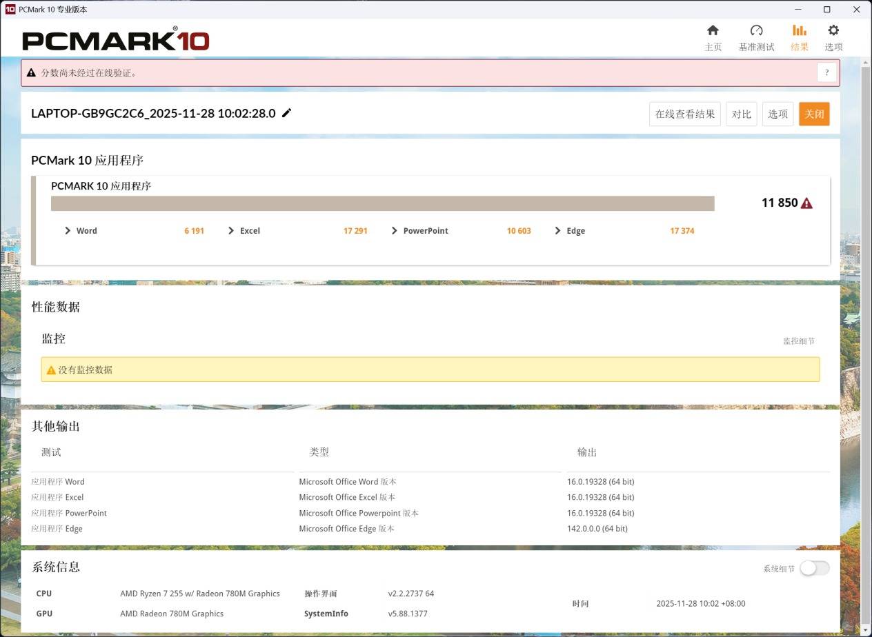 使用PCMARK 10中的应用程序项目进行文字办公性能的评估,该测试会调用Office三件套Word、Excel、PPT,以及Edge浏览器进行一系列的脚本操作后加权得出性能得分,最终得分为11850分。