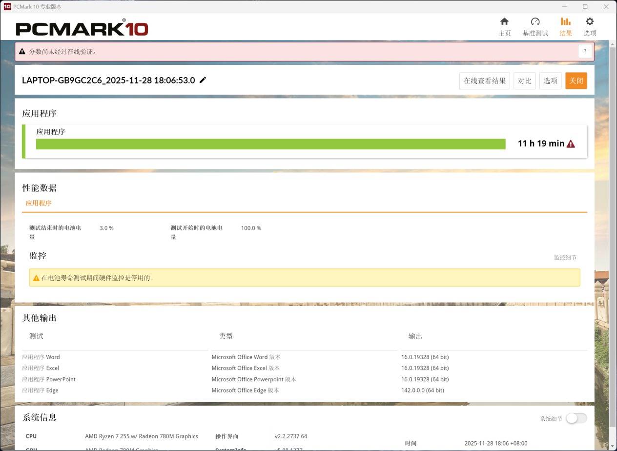 使用PCMark 10的应用程序模式进行续航的测试,与其基准性能测试相同,也会调用Office三件套与Edge并持续执行脚本,在Windows节能模式、深色模式、50%屏幕亮度,连接Wi-Fi的情况下,最终的续航成绩为:11小时19分钟,进行半天多的不插电办公没有任何问题。