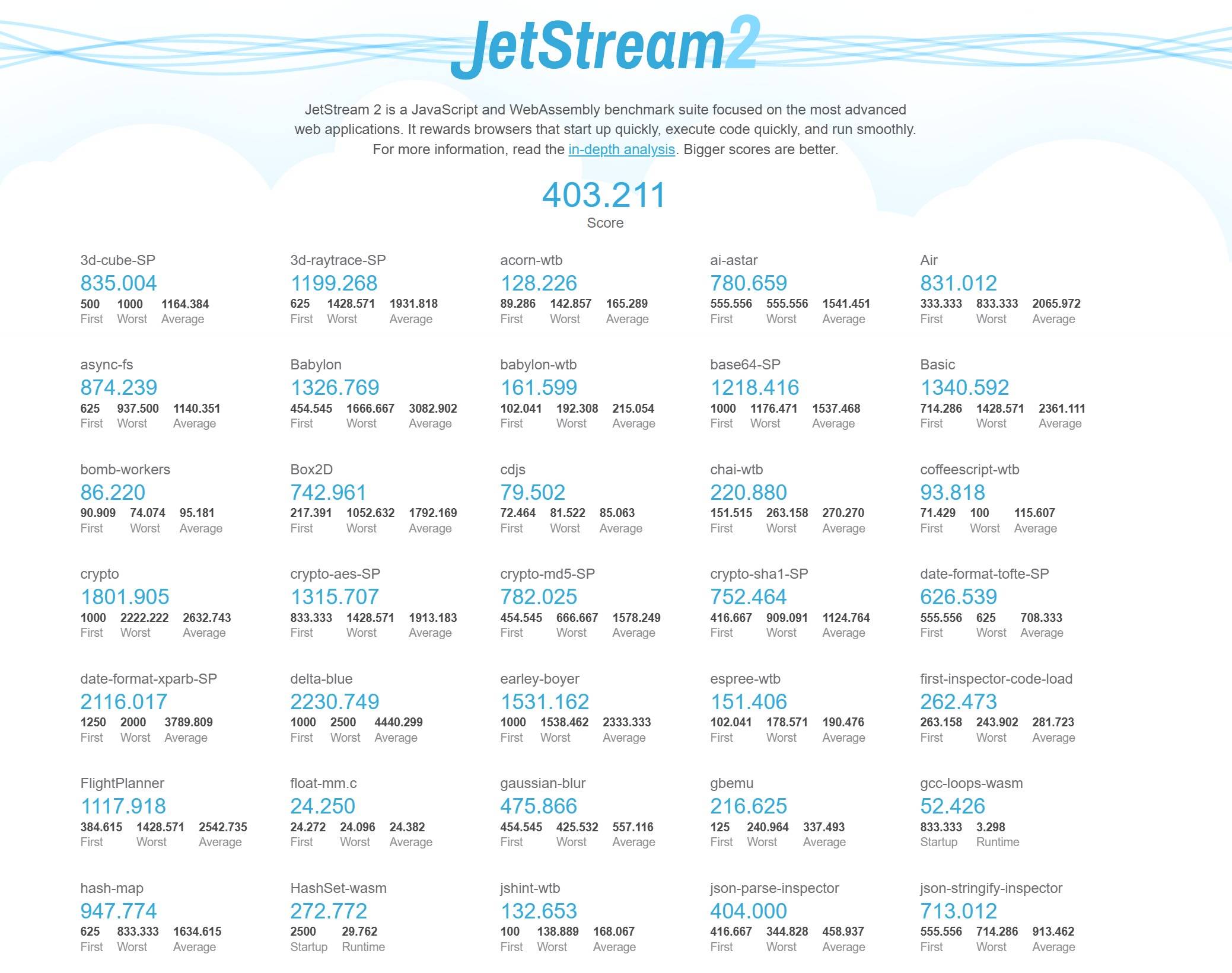 在JetStream2中,包含了基于Java、Web Assembly等高达64个子项目的测试,加权后最终总评为:403.2分。