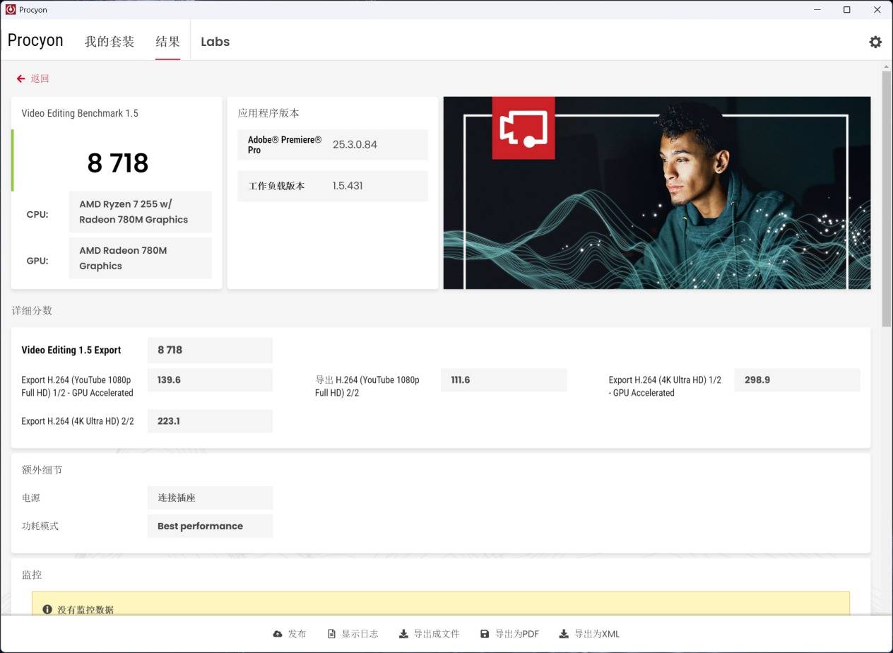 Video Editing BenchMark会调用Adobe Premiere进行脚本操作加权后得出总评,最终得分为:8718分。