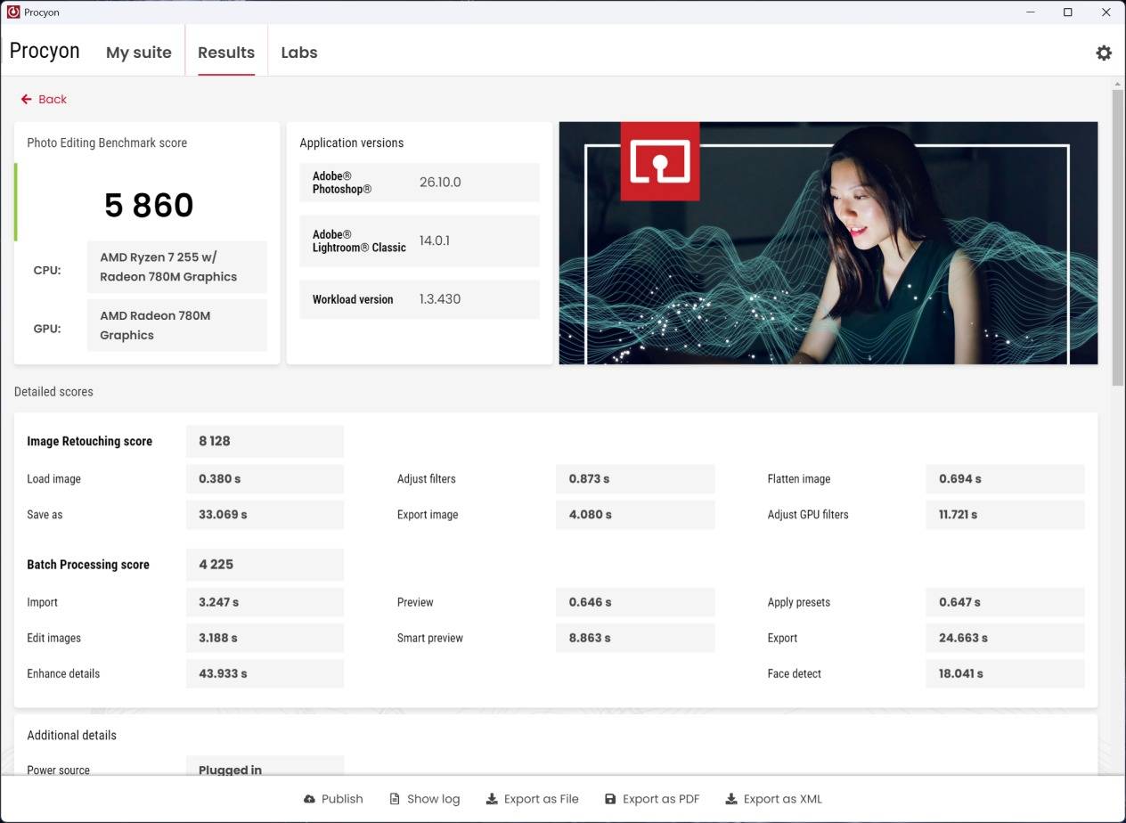 Photo Editing BenchMark会调用Adobe Photoshop、Lightroom进行脚本操作后加权得出总评,最终得分为:5860分。