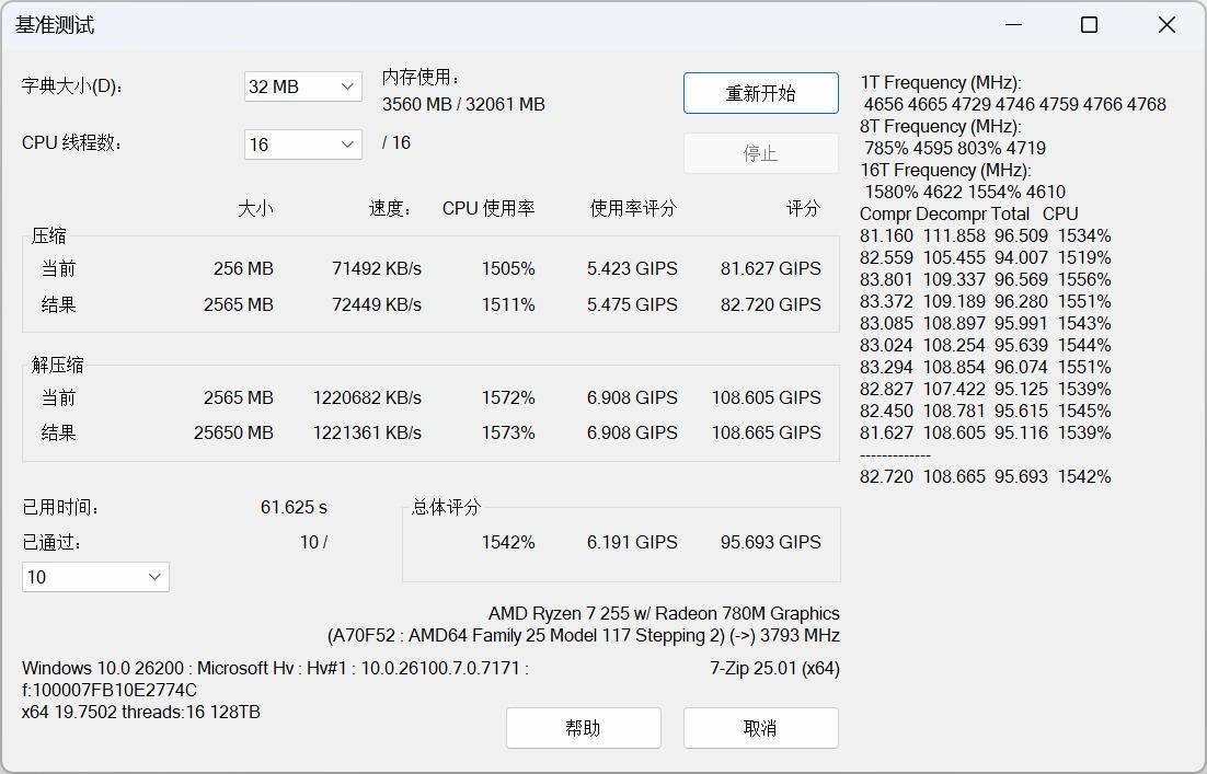 压缩、解压缩,也是日常和办公中笔记本经常使用的功能,在压缩软件7-Zip自带的BenchMark中,字典大小32MB,压缩/解压缩性能评分分别为82.72GIPS、108.665GIPS,总评为95.693GIPS。