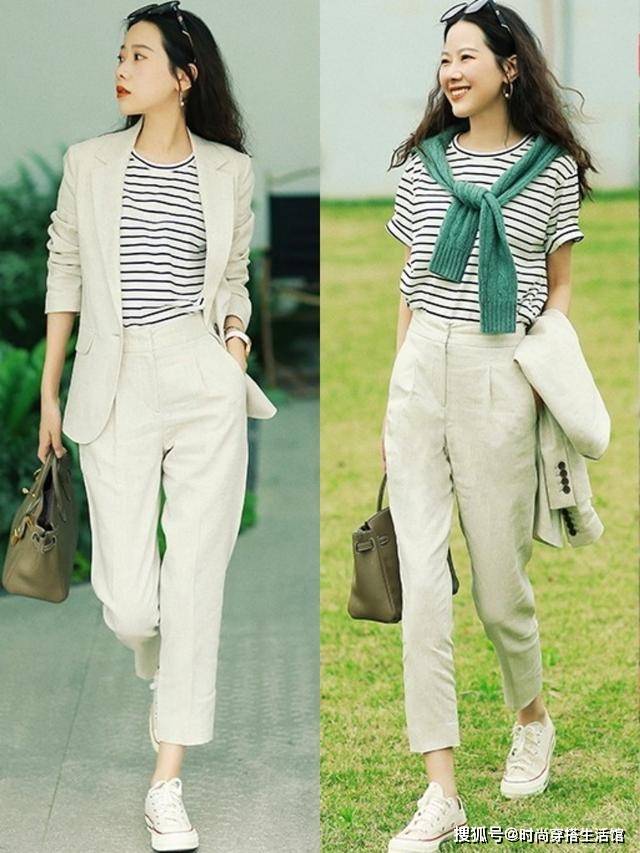 通勤风与休闲风的融合,往往就在配饰的转换之间,如果上班想穿得休闲一点,但不想显得太随意,第一是切换风格感强烈的单品,比如清爽减龄的条纹衫,与西装裤搭配在一起,瞬间有了夏日的活泼感;