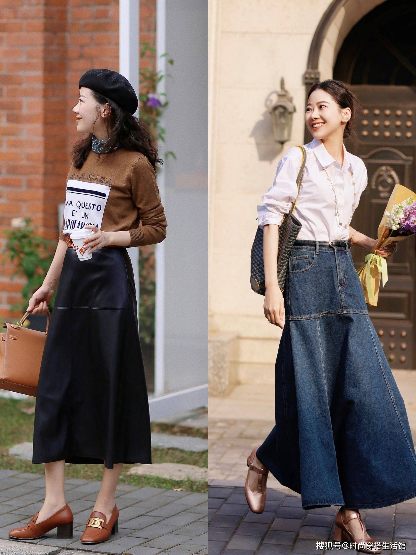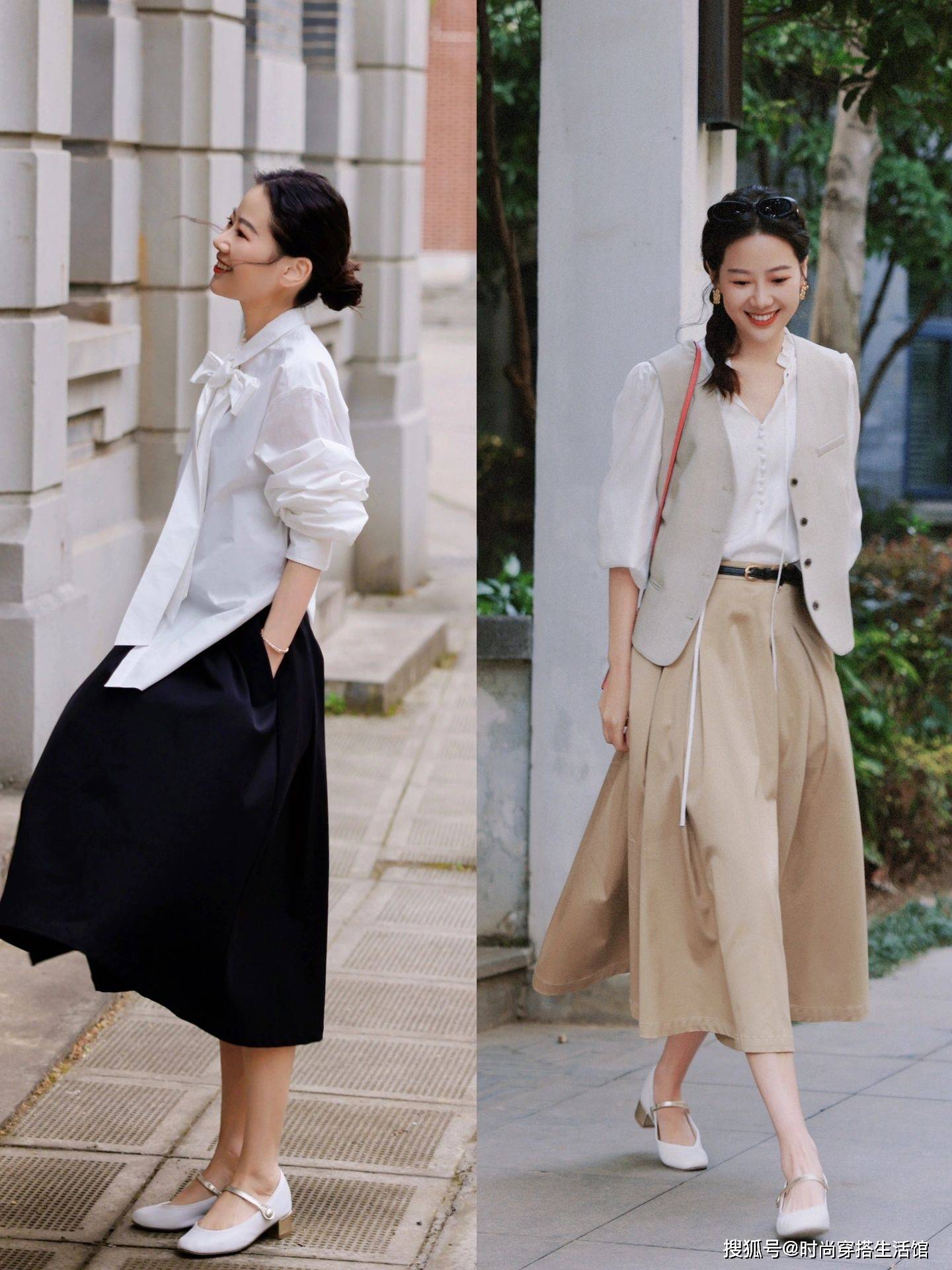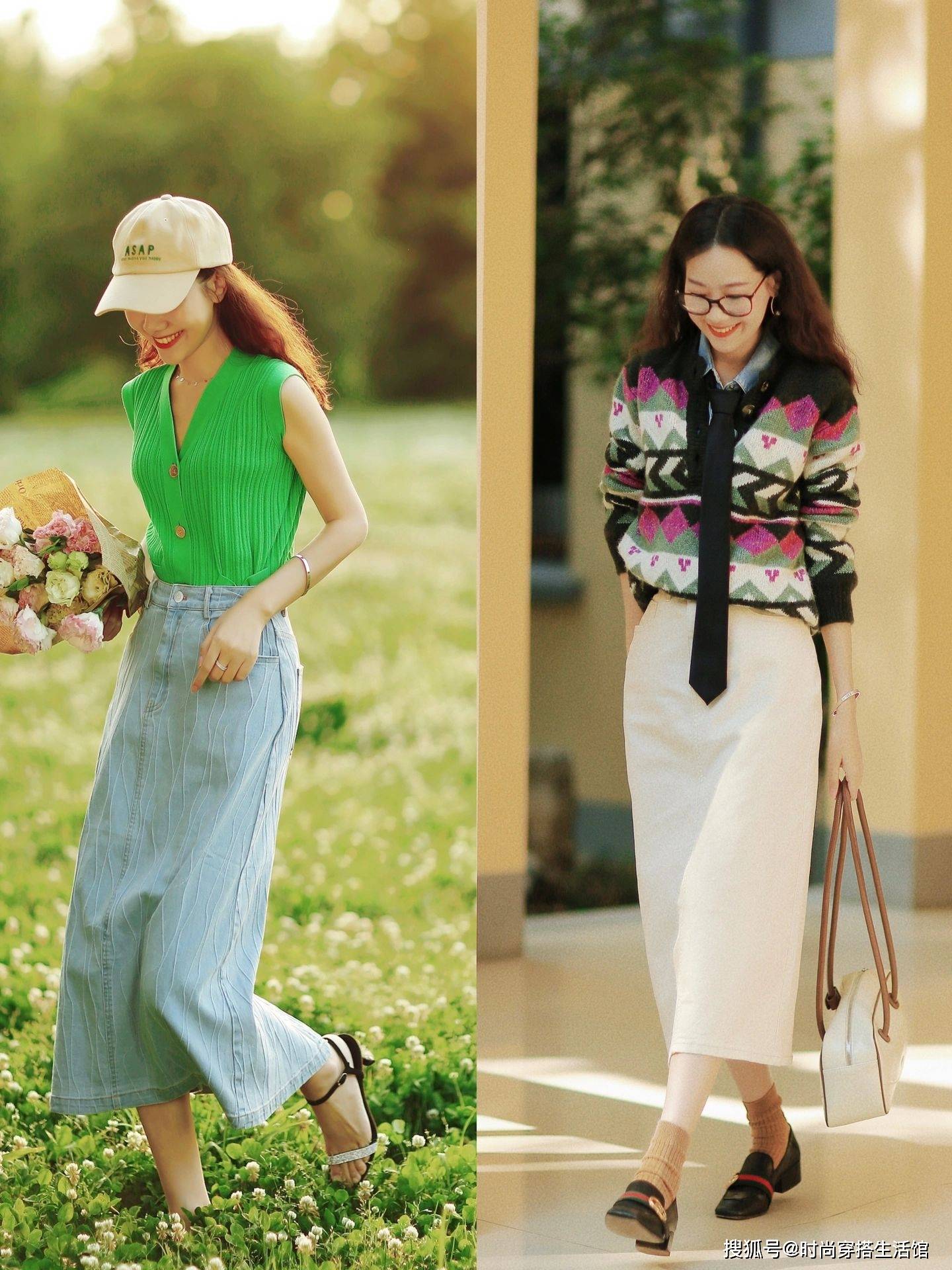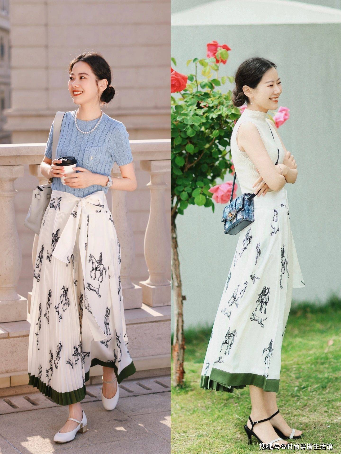 女性到了30+,很容易走向两个极端,一种就是过于沉闷简约,而另一种则是格外的花哨张扬,那究竟哪种更适合30+女性穿出亮眼的效果呢?这组穿搭左边选择了颜色清亮的高级灰针织衫+印花繁复的水墨感半身裙,演绎不一样的风格。