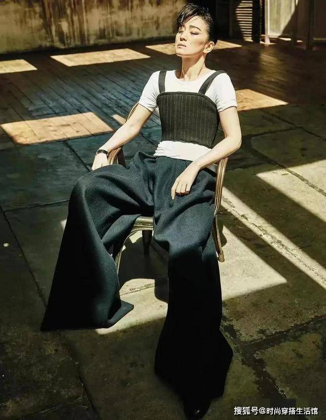 虽然巩俐选择的每套穿搭都在强调帅气感,但是利用两件单品叠穿则更符合女性审美,打造1+1大于2的时尚感会瞬间增加造型的时髦洋气度,无论是白T与吊带背心的叠穿还是老头背心搭配抹胸腰封,都比单件单品穿搭更加洋气,所以看似简单的黑白搭配却处处彰显着穿搭魅力,这种精心打造的时尚感与男性的随性审美南辕北辙。