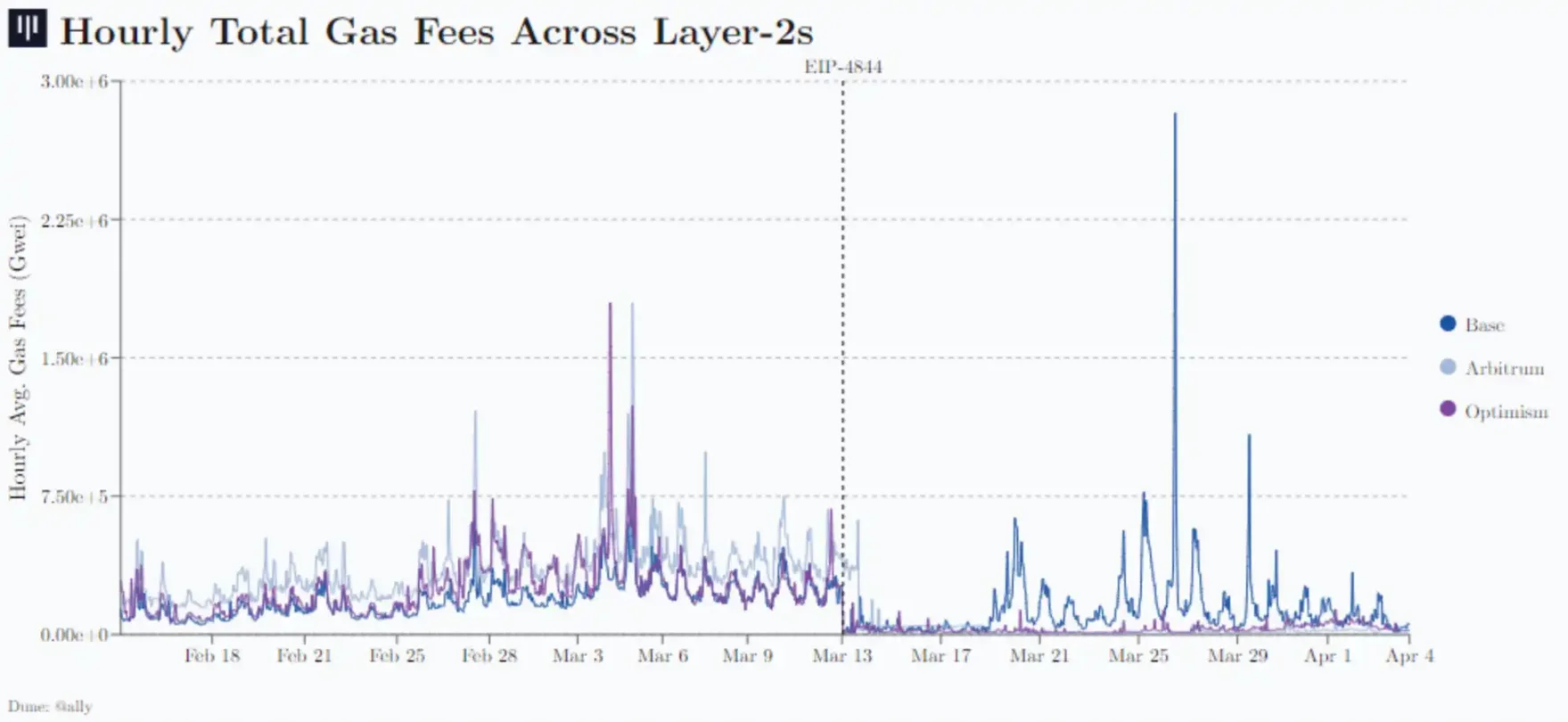今年三月,以太坊实施了 EIP-4844 提案,旨在提高网络容量并降低 Layer-2 的交易成本,使得像 Arbitrum 和 Optimism 这样的网络享受到了显著的手续费费用降低。然而,在该提案实施后不久,Base 网络的手续费价格却出现了激增,超过了 EIP-4844 推出前的水平。