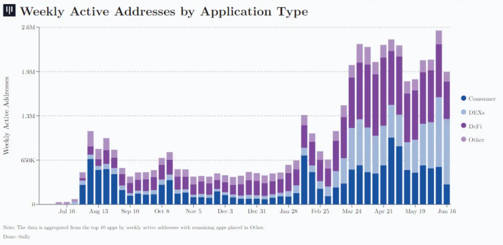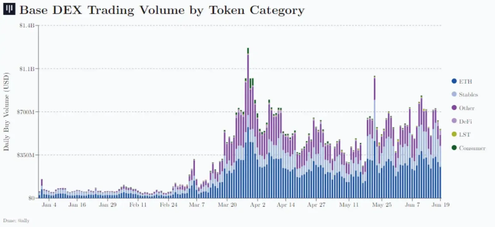在此期间,Base 的用户活动显著增加,主要由 DeFi 交易活动推动。鉴于 Base 的生态系统一直倾向于消费者导向的应用程序,这种激增尤其出乎意料。Base 最初由 Coinbase 团队孵化,得益于广泛的营销和品牌推广,致力于打造一个鼓励创作者、开发者和社区参与的链。因此,该生态系统主要由消费者应用组成,其中最成功的应用如 Friend.tech,都是面向消费者的。