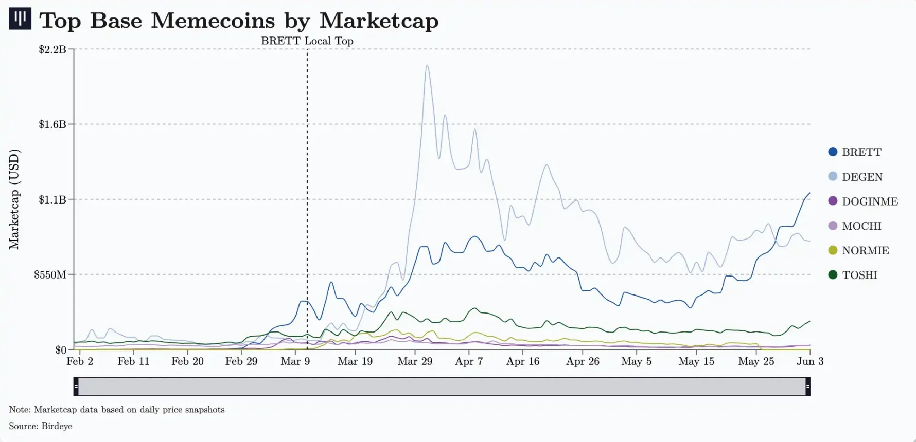 尽管自 Base 网络上线以来,meme 币就已经存在,但直到今年三月之前,没有任何一个 meme 币能引起市场的广泛关注。Base 主网的最初上线是由 meme 币交易狂潮推动的。在网络正式上线前,成千上万的用户涌向 Base 进行 meme 币交易。随着新应用程序的启动,这些代币的交易活动逐渐减少。受以 Pepe 为主题的流行书籍中的角色启发,BRETT 代币在 2 月底至 3 月初上线,并迅速在 Base 上崭露头角,其市值在大规模 meme 交易活动出现前就已达到 3.5 亿美元。它的迅速崛起不仅使其脱离了典型的市场趋势,还在整个网络上引发了更广泛的交易热潮。