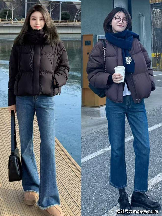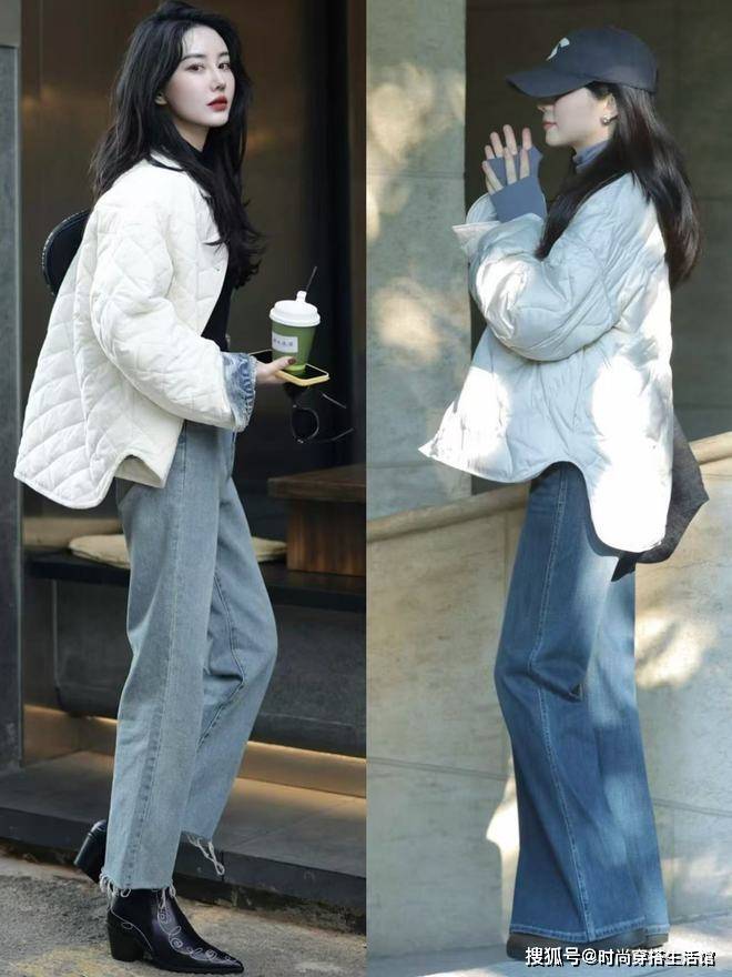 天气越来越冷,正因为如此,大家在挑选棉衣时会十分关注它的长度问题。长款棉衣长度若超过了膝盖的位置,上身之后显得臃肿,对于小个子来说,在身高上也会形成不小的压力。短款棉衣,长度刚刚好遮住臀部的款式,既不影响保暖,更不会挑剔身高。30+女生用菱格纹的短款棉衣搭配微喇叭牛仔裤,短棉衣不仅帮助提高了身体重心,过脚面的喇叭裤更延长了腿线,巧妙地拉高了身线。