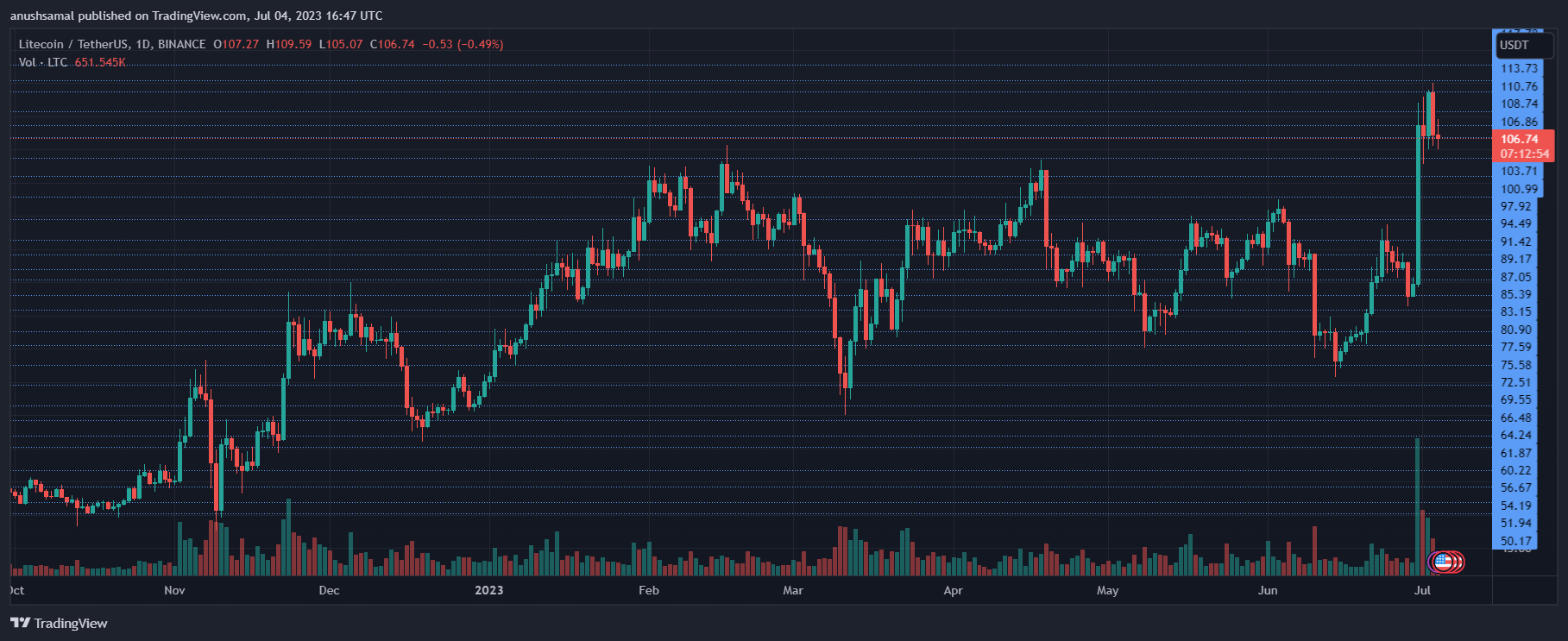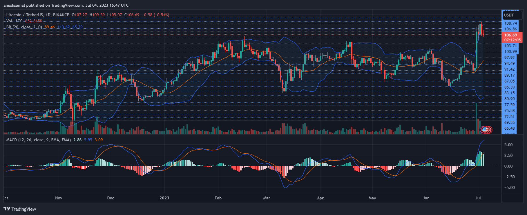 目前,莱特币的价格在 106 美元左右。 尽管低于 108 美元的阻力位,但这个位置并不是主要的障碍。