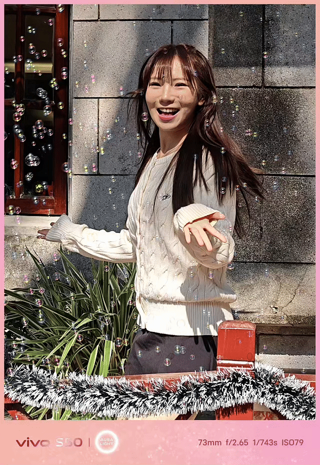 而在氛围感营造方面,vivo S50带来了氛围感拉满的「复古撕拉片」玩法,找一面白墙作为拍摄背景,就能完美复刻出传奇宝丽来撕拉片的效果,精准还原朦胧美感与波动晕染,同时肤色依旧透亮有质感。