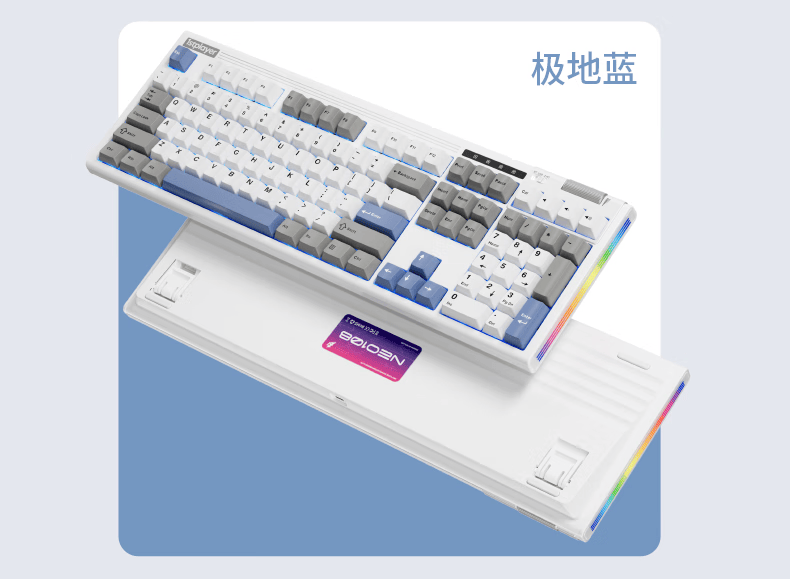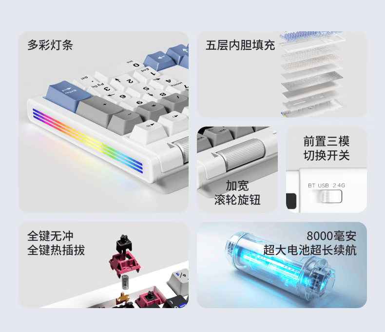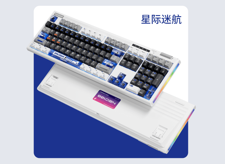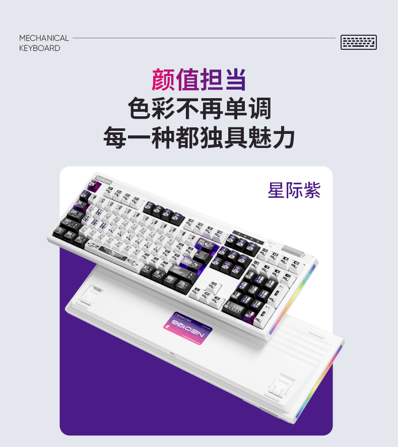 紫星轴版本采用 PBT 键帽,提供午夜蓝、极地蓝配色;蔓越莓轴版本采用 PBT 五面热升华 + PC 透明键帽,提供星际迷航、星际紫配色。键盘内置 8000mAh 大容量电池。