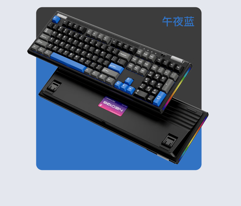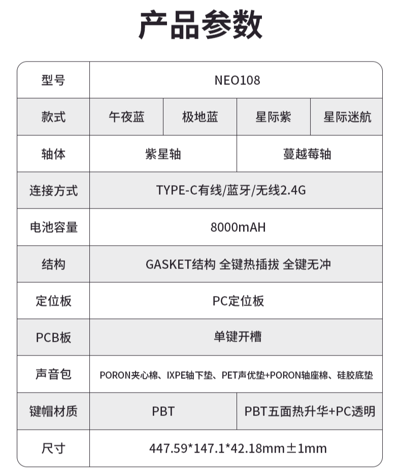 NEO108 前置三模切换开关,左右侧面均包含功能键,还有多彩灯条。右上部配备加宽横向滚轮,底部采用二段式脚撑设计。内部采用 Gasket 垫片固定结构,集成单键开槽 PCB、PC 定位板,支持全键热插拔和 RGB 背光。