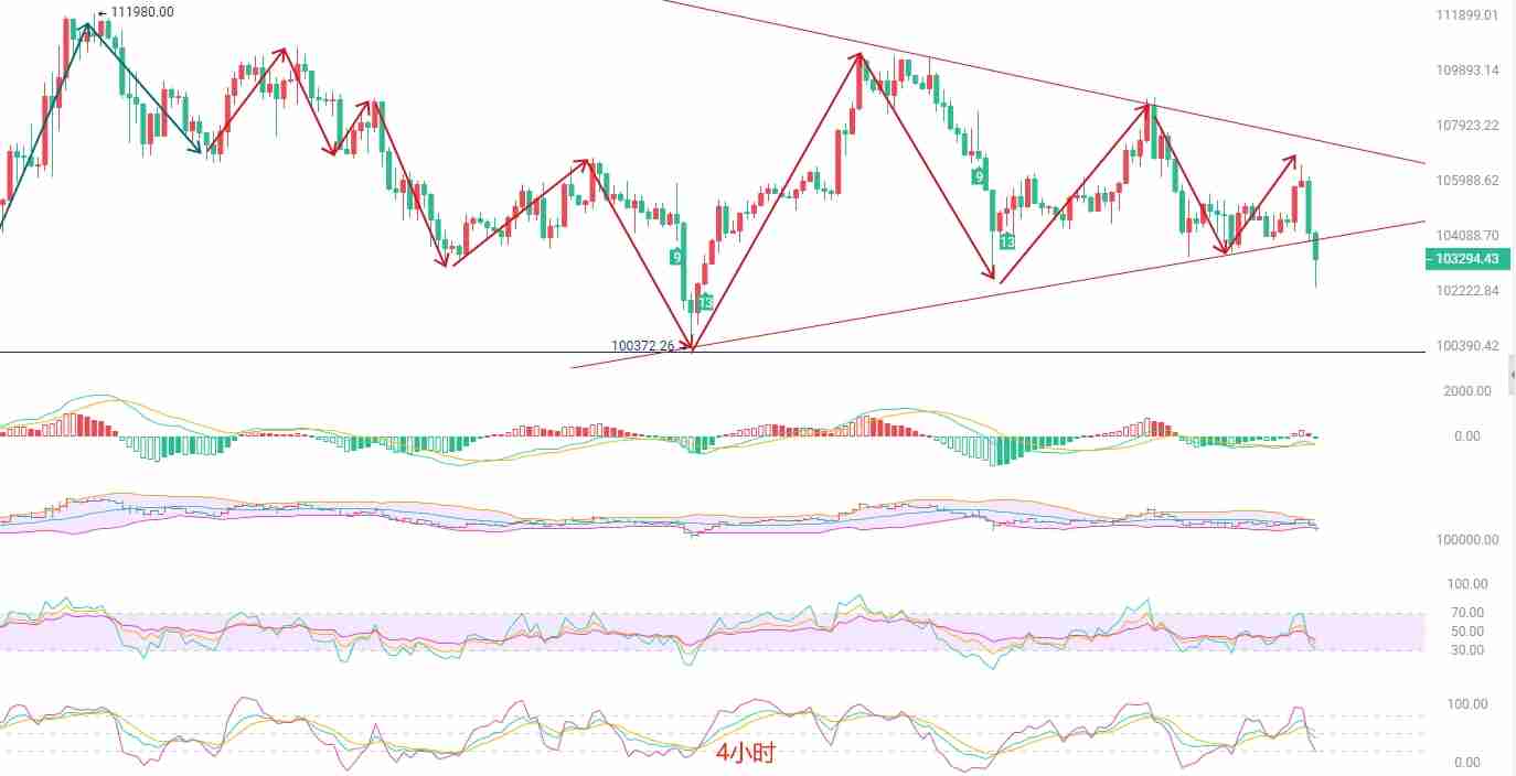 再来看看四小时K线,连续两根大阴线直接跌破了EMA趋势指标,EMA向下交替扩散的趋势也结束了。MACD指标开始缩量,DIF和DEA金叉也被扭转,形成了死叉。布林带虚破上轨105850后,就出现了跳水行情,直接跌穿下轨支撑103500,空头动能初步释放,但我觉得还没完全结束。可以关注上方104000附近的上升趋势压力位,如果之前没做空的,可以把这里作为一个参考点。