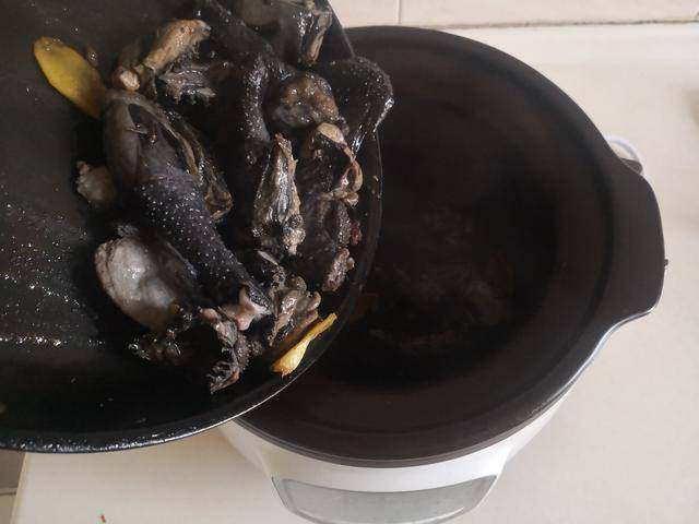 2. 提前将配菜:姬茸菇和黑木耳清洗干净后用水泡软, 将炒好的乌鸡块放入电炖锅中;再加入泡好的姬茸菇和泡菌菇的水,注意水要一次性加足,不要中途加水;