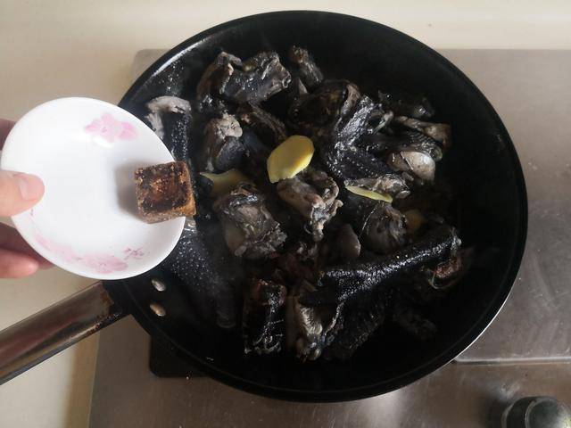 制作过程:1. 热锅凉油,将准备好的乌鸡块放进锅中煸炒,炒干水分后加入少许姜片进锅翻炒,再加入1小块红糖进锅翻炒至融化;