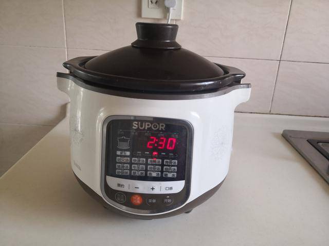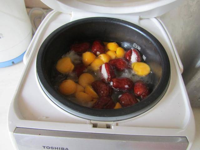 4. 按下电饭煲锅上炖煮米饭的功能键,待其炖煮好后按个头口味加入少许冰糖融化即可。