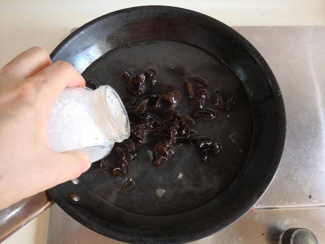 2. 提前将黑木耳用冷水泡软备用,烧锅水,将泡软的黑木耳放进锅中焯煮两、三分钟后捞出备用;