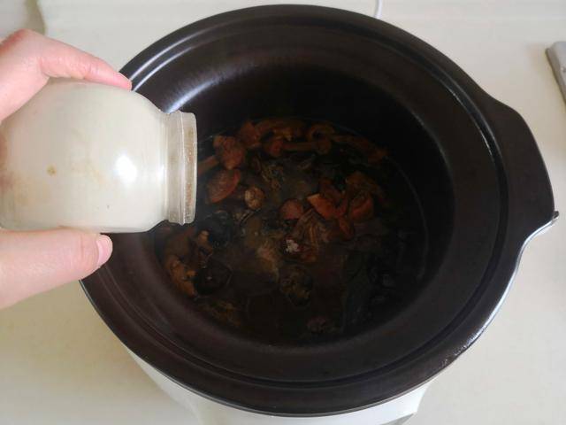 4. 时间到, “木耳姬茸菇乌鸡汤”就炖好了,最后加入少许盐和胡椒粉调味即可。