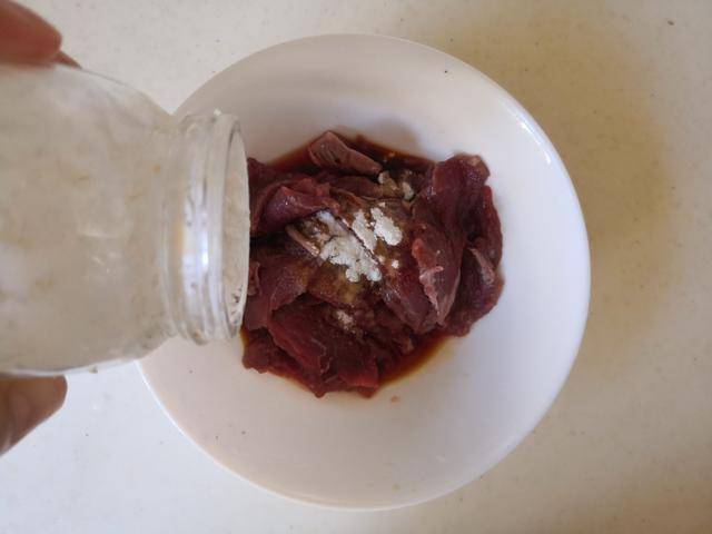 制作过程:1. 牛里脊肉切成片后加入少许盐、淀粉、料酒、生抽和姜末等调味料拌均匀腌制5分钟备用;