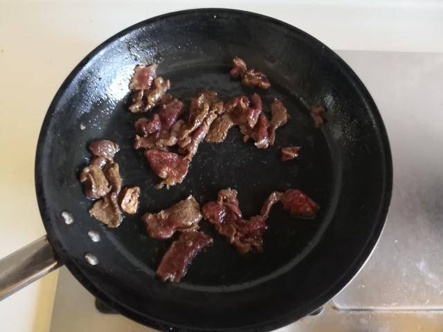 3.烧热锅放入少许油, 将腌制好的牛肉片放进锅中翻炒至变色后先盛出来备用;
