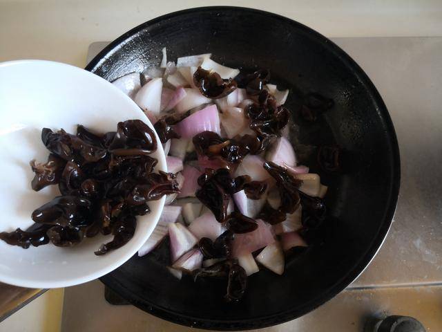 4. 锅中留少许油,先将洋葱片放进锅中爆香,再加入焯好的黑木耳放进锅中翻炒几下;
